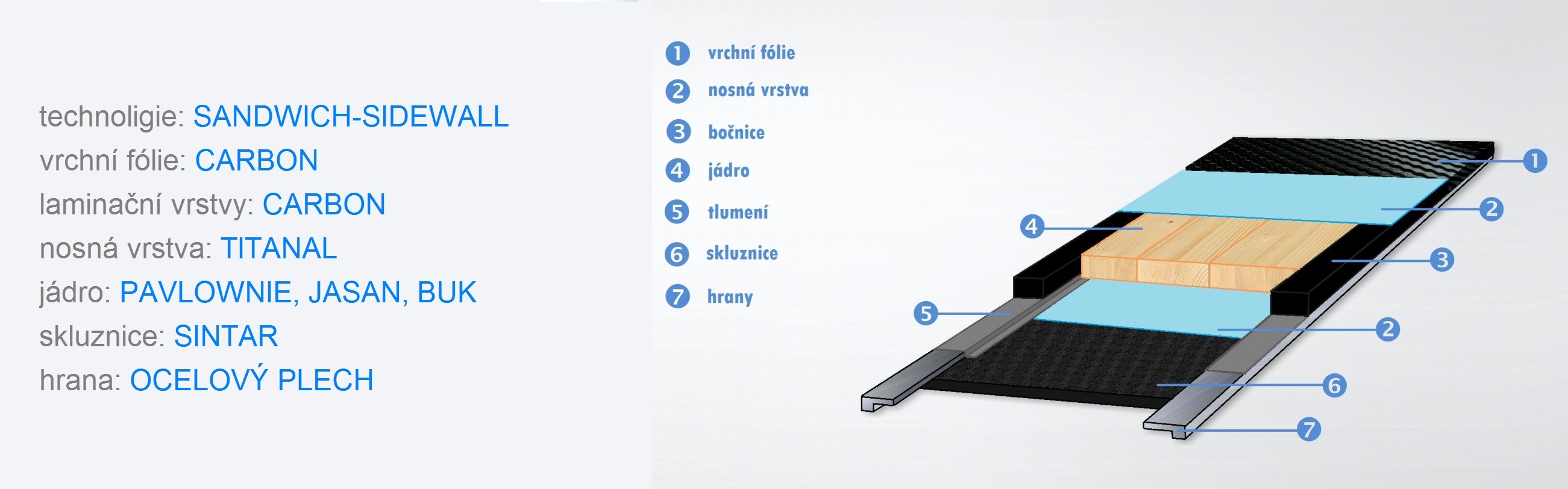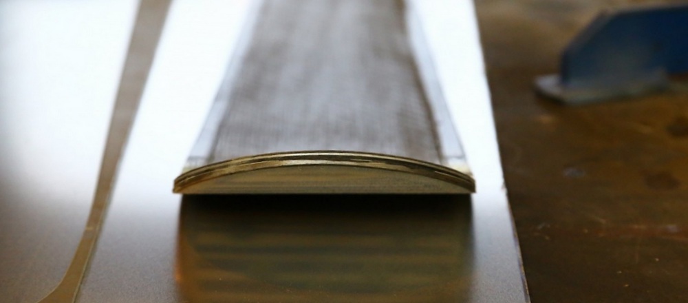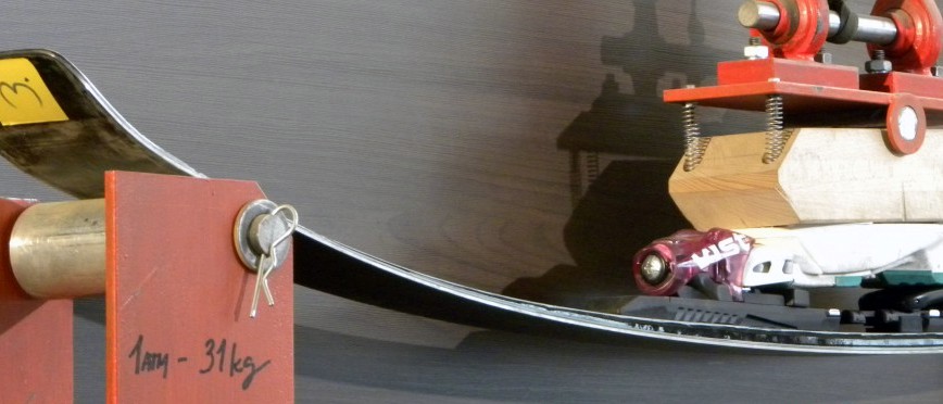 Podélná tuhost a torze... od začátku bylo jasné, že výborným vlastnostem uhlíkových vláken nemohou současně používané technologie konkurovat. Už první páry vyrobených lyží vykazovaly skvělou torzní tuhost, která je při použití šikmých rovingových vrstev samozřejmá. Po několika letech vývoje jsme došli k výrazněji tvarovanému jádru, které umožňuje dostatečný přenos síly i citlivé ovládání. V malé míře používáme také titanal ke zpevnění horních hran a zlepšení přenosu tlaku na hrany.